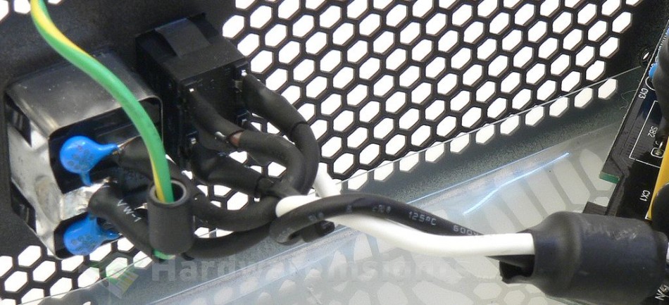 The input filtration – as usual – starts directly on the AC inlet with two ceramic Y capacitors. There is a ferrite bead on the earth/ground wire and also phase+neutral wires go through one more bead on the way from double-pole switch towards the main board. The inlet itself is partially shielded.