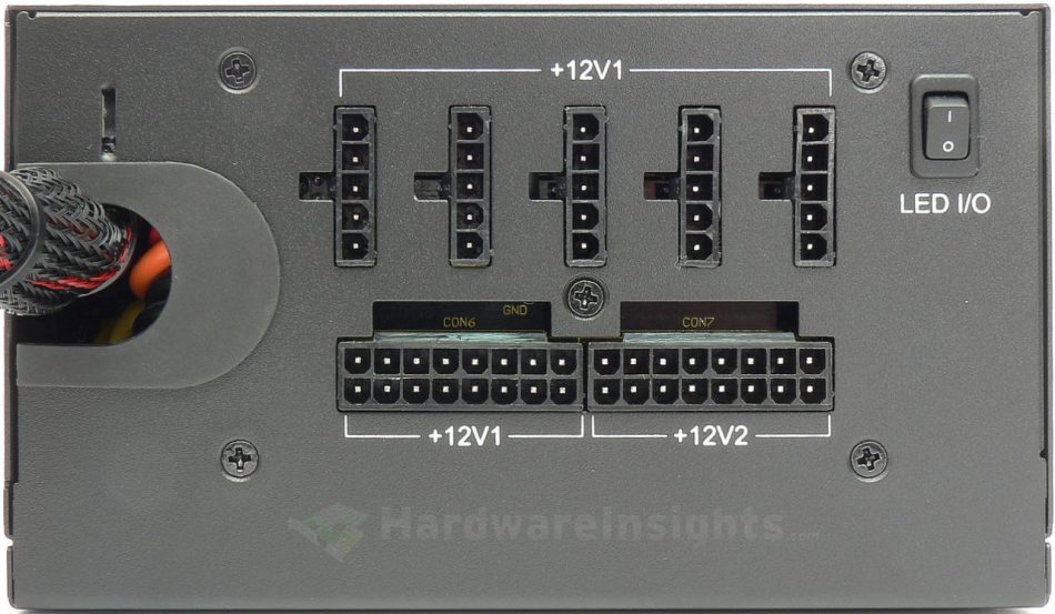 We can see the modular cabling board uses flat 5pin connectors for peripherals and then proprietary 16pin connectors for PCIe cabling. Upon closer inspection, you can see each is basically consisting of two almost-like-EPS connectors (the bottom pins are all non-square) next to each other. The provided cabling also only uses these individual 8pin connectors on one side (with 6+2pin PCIe) on the other side. Antec also specifies which +12V rail powers which set of connectors. There is also the switch to turn the fan backlight on or off.