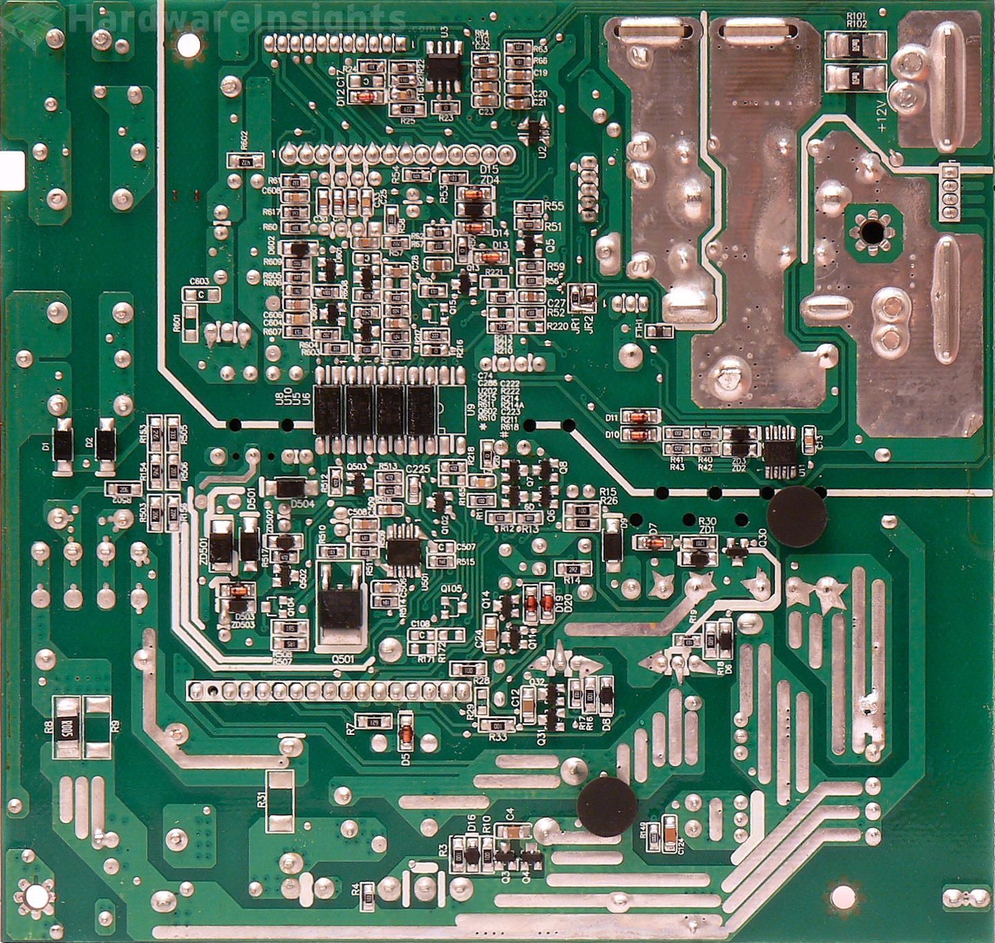 As usual I will focus on the overall build quality and other things like electrical safety here as the quality of the components used was already discussed before. Primary and secondary side separation is good. Where needed, there is an extra layer of insulation, which is not on too many places here. Thermistor is not covered with heatshrink though. Conductive paths are reinforced, but not really that much, the layer of solder is minimal – at least on the main board. That is also the reason why the PFC coil is soldered so badly on both sides.