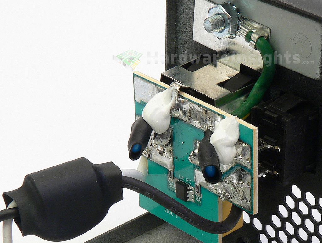 The inlet itself carries a small daughterboard with Champion Micro CMD02X IC used to discharge the film X caps only after power is lost, not continuously while wasting power. It is a very clever way of saving space and it is also good the board is here as it can also discharge capacitors on the main board if the fuse is intact (and if not, the charge stays there and cannot harm anybody touching the inlet pins).