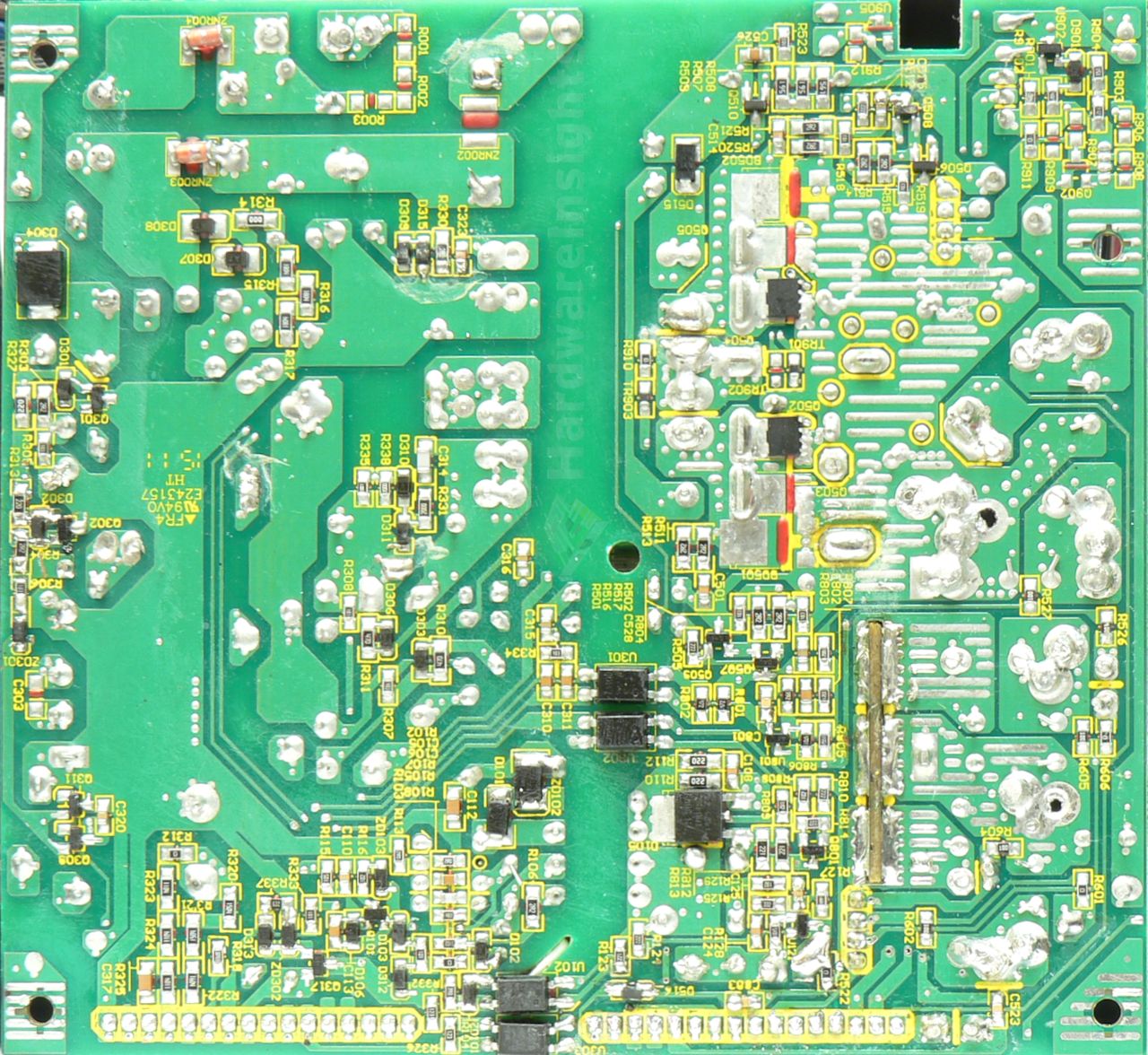 I’ve been in consultation with regard to my results with a Seasonic representative, and my findings thereof based on the improvements in the design of the Antec TruePower Classic 550 W (which is also based on the same Seasonic model). In that unit, I replaced the burned diode rectifiers with ones that have a 50 % better rating, and with that change, the unit’s overload protection did indeed kick in and cut off the power before the rectifiers could be pushed too far again. Based on this finding, Seasonic provided me with a new prototype which doesn’t exhibit the same problem as that earlier revision model, except that their fix was different than my own, as they simply did not install the rectifiers at all. It also seems to me that they possibly changed some of the surface-mount components on the underside of the board to adapt the driving circuitry for this change.
