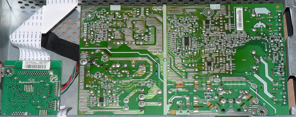 The power board is screwed using three screws. The cable from it, leading to signal board, is hard-soldered into the power board and can only be disconnected from the signal board. If you have some practice, you can unplug it directly, but plugging it back is tricky. If you have difficulty, then also remove signal board, connect the cable and place it back. For that you need to remove hexagonal screws by the sides of the D-Sub connector. I personally try to avoid this extra work.