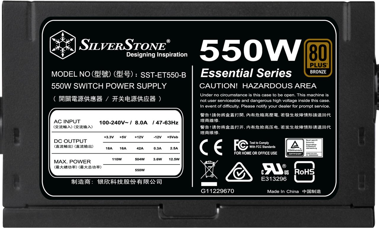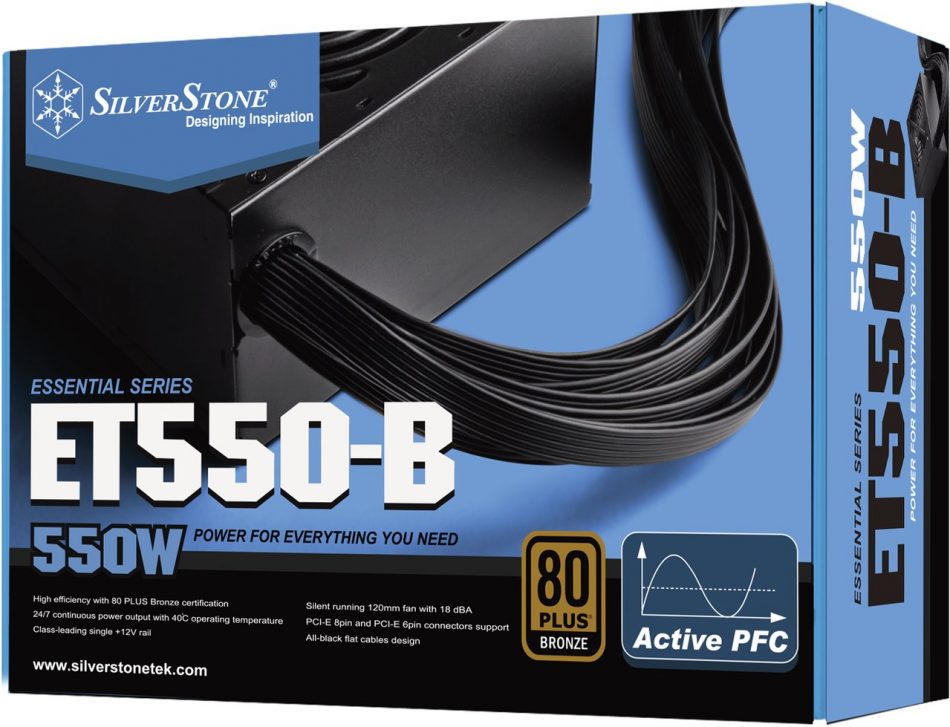 Silverstone has announced it has a new series of somewhat cheaper power supplies available in Europe, the Essential Series. There are currently two units, the 550W rated SST-ET550-B, and 650W SST-ET650-B. Both units come from Sirtec (High Power) and bear 80 PLUS Bronze certification (@115 V) rated at 40 °C continuous. They have fixed cabling but welded into flat ribbons.