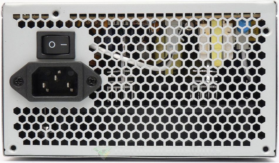 The backside uses ordinary hexagonal pattern. The perforations cover most of it, they are even under the AC switch. The AC inlet itself uses pins made of a layer of thinner metal folded over and pressed together.